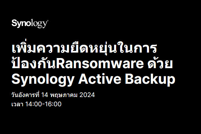 วันอังคารที่ 14 พฤษภาคม 2024 | 14:00 – 16:00 น. (เวลาไทย) เชิญร่วมงานสัมมนาออนไลน์ เพิ่มความยืดหยุ่นในการป้องกันRansomware ด้วย Synology Active Backup